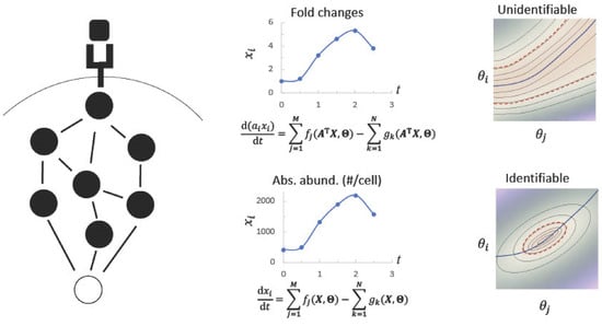 In complex biological systems, reducing the biochemistry (reactions) of the system to construct a network of ordinary differential equations (ODE) or partial differential equations (PDE) is a common approach [168]. Beginning with an equation for each species reaction written in terms of rate of change, empirical data then provide estimates of values of unknown parameters such as kinetic constants [169]. To simplify these models, certain assumptions are frequently made, for instance multiple phosphorylation sites on a peptide/protein having a similar impact [170]. Including all the phosphorylation states of a protein in a model can lead to a combinatorial explosion [171,172] and an exponential increase in reactions and subsequent model size. For example, a study that modeled signaling in the ERK and Akt network that included 7 receptor dimers and 28 proteins in response to two ligands generated a total of 499 differential equations, 201 reaction rates, and 28 non-zero initial conditions [2. Biological dynamics complicate parameter optimization of ODE/PDE models. One way around the complexity of ODE/PDE models is to simplify the system by “coarse-graining” which reduces the number of equations to just those describing molecular patterns that operate interdependently and are relevant to the system [158,173,174].
