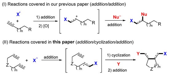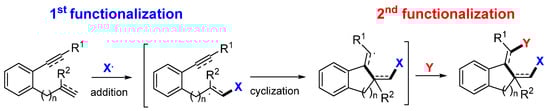 There is a large number of reviews on the radical difunctionalizations [5,6,7,8,9,10,11,12,13,14,15,16]. In a recent paper from our group, we summarized radical addition followed by nucleophilic addition for 1,2- and remote difunctionalizations to introduce X and Y groups to the products (Scheme 1, I) [17]. Presented in this paper is another kind of radical difunctionalization that is initiated with the addition of radical X. followed by radical cyclization and then a second functionalization with Y through coupling or addition to obtain the product (Scheme 1, II).