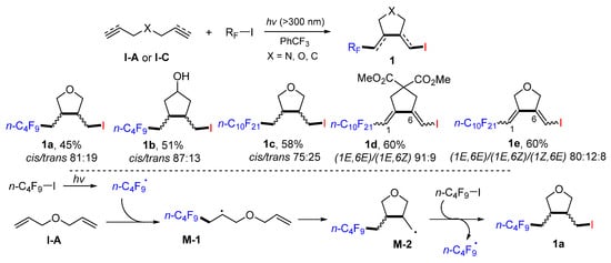 In 2005, Ogawa and coworker reported a near-UV light-mediated radical reaction of dienes, diynes, and enynes for the synthesis of iodoperfluoroalkylated cyclic products. The reactions of dienes, diynes, or enynes and perfluoroalkyl iodides in PhCF3 under the irradiation of xenon lamp afforded products 1 as a mixture of cis/trans isomers in moderate-to-good yields (Scheme 5) [18]. A proposed mechanism indicated that the n-C4F9 radical generated from n-C4F9I under the light adds to diene. The intermediate M-1 undergoes 5-exo cyclization to give alkenyl M-2, which then reacts with n-C4F9I through the iodine atom transfer to give product 1a.