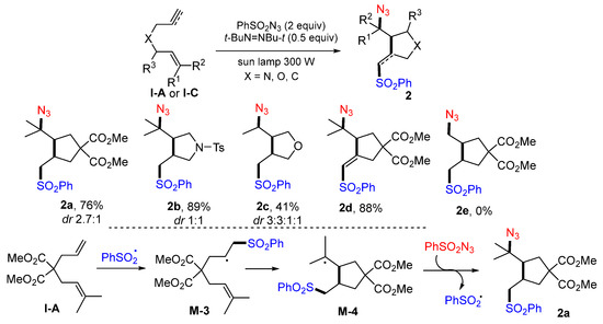 A sun lamp-mediated radical reaction for making azidosulfonylated cyclic products was reported by the Renaud group in 2008. Dienes, diynes, or enynes in dry benzene reacted with benzenesulfonyl azide with radical initiator di-t-butyldiazene to give azidosulfone products 2 in moderate-to-excellent yields (Scheme 6) [19]. This method is good for the formation of tertiary and secondary azides 2a–d, but not for primary azide 2e. The reaction process involves the addition of PhSO2 radical to the less hindered alkene to form intermediate radical M-3, 5-exo cyclization for radical M-4, and N3 radical transfer from PhSO2N3 to give product 2a.