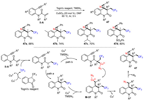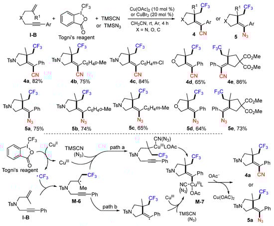 A method for cyclative trifluoromethylation of 1,6-enynes was reported by the Liang group in 2014. The reaction of 1,6-enynes, Togni’s reagent, and TMSCN (or TMSN3) in CH3CN under the catalysis of CuII gave CF3-containing heterocycles 4 and 5 (Scheme 8) [21]. The CF3 radical produced from the Togni’s reagent under the catalysis of CuII adds to the C=C double bond of 1,6-enyne to form the radical intermediate M-6, which is converted to cyclized metal complex M-7 through path a or path b. At the last step, the reaction of M-7 with TMSCN or TMSN3 gives corresponding cyanotrifluoromethylated or azidotrifluoromethylated five-membered ring products 4a or 5a.
