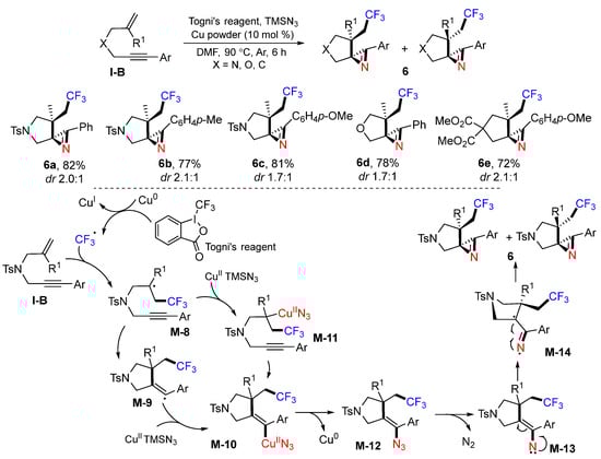 A Togni’s reagent-based synthesis of CF3-substituted spiro 2H-azirines was reported by the Liang group in 2015. The reaction of 1,6-enynes with Togni’s reagent and TMSN3 in the presence of Cu0 powder as a catalyst afforded diastereomeric products 6 in good-to-excellent yields (Scheme 9) [22]. A proposed mechanism suggests that the CF3 radical generated from Togni’s reagent through SET of Cu0 is added to the C=C bond of 1,6-enyne to produce the radical intermediate M-8. Sequential 5-exo cyclization and trapping of the radical M-9 with CuII and TMSN3 give CuII azide complex M-10. Complex M-10 may also be obtained from the formation of complex M-11 and subsequent cyclization. Reductive elimination of M-10 followed by the elimination of N2 from azide M-12 gives alkenyl nitrene M-13. The cyclization of M-14, a resonance structure of alkenyl nitrene M-13, gives the spiroketal products 6 as a pair of diastereomers.