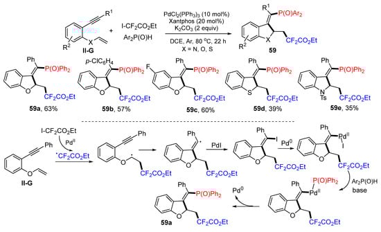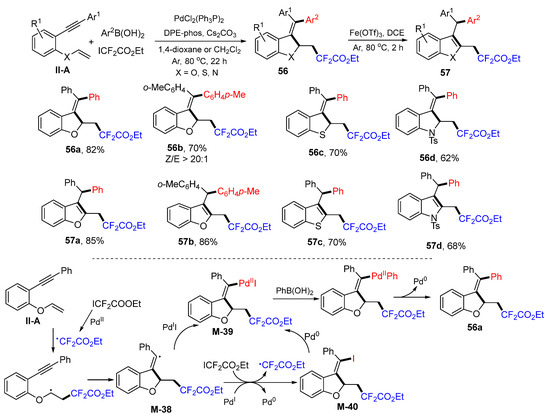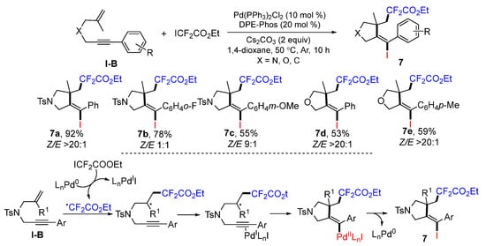 Liang’s lab introduced a method for Pd-catalyzed radical cyclative iododifluoromethylation of 1,6-enynes in 2015. The reaction of 1,6-enynes and ethyl difluoroiodoacetate in dioxane under the catalysis of Pd(PPh3)2Cl2 and bis-[2-(diphenyl-phosphino)phenyl]ether (DPE-Phos) gave iododifluoromethylated heterocycles 7 in good-to-excellent yields (Scheme 10) [23]. The CF2CO2Et radical is generated from ICF2CO2Et through the reduction of Pd0Ln. Radical addition to the C=C double bond of 1,6-enynes followed by the cyclization to PdILnI-activated alkyne group and reductive elimination of the Pd0Ln gives iododifluoromethylated products 7.
