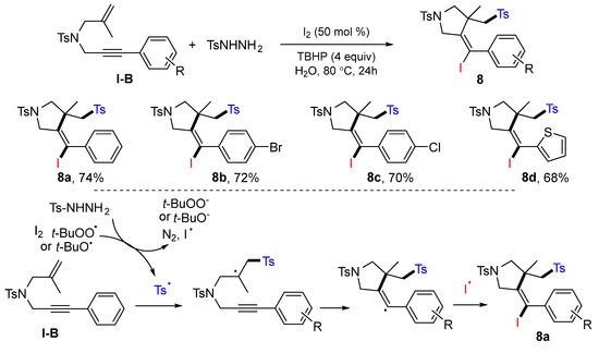 A proposed mechanism indicated that the sulfonyl radical generated from the reaction of sulfonyl hydrazide and TBHP adds to the C=C double bond of 1,6-enyne, followed by the radical cyclization and coupling with iodine radical, to give product 8a.