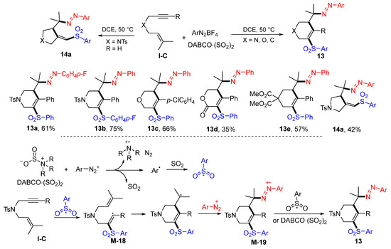 The Wu group, in 2017, introduced a reaction of 1,6-enynes with DABCO·(SO2)2 and two equivalents of ArN2BF4 in DCE to give diazosulfonated six-membered heterocycles 13 in moderate-to-good yields (Scheme 14) [27]. Five-membered heterocycles 14a could be obtained using unsubstituted terminal alkynes as the substrates. The reaction mechanism suggests that the initially sulfonyl radicals, generated from the reaction of ArN2BF4 with DABCO·(SO2)2, adds to the C≡C bond of 1,6-enynes to form vinyl radical M-18, followed by 6-exo cyclization and trapping with aryldiazonium cation to give intermediates M-19. The last step SET of arylsulfonyl radical or DABCO·(SO2)2 to radical M-19 gave products 13.