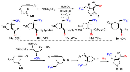 In 2018, the Liu group reported the synthesis of bromotrifluoromethylated five- and six-membered heterocycles. The reaction of 1,6- or 1,7-enynes, NaSO2CF3 and NaBrO3 in DCM/H2O produced products 18 in good yields (Scheme 17) [30]. The CF3 radical, generated from the reaction of NaSO2CF3 and NaBrO3, adds to the terminal carbon of alkene followed by 5-exo or 6-exo cyclization (n = 2) and then Br-atom abstraction to give product 18.
