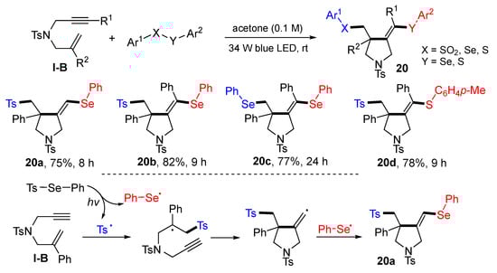 A visible light-promoted reaction of 1,6-enynes for the synthesis of difunctionalized pyrrolidines was introduced by the Wang group in 2020. The reaction of 1,6-enynes, and chalcogens (such as benzenesulfono–selenoate) in acetone at room temperature under the radiation of blue LED afforded products 20 in moderate-to-good yields (Scheme 19) [32]. The reaction mechanism suggests that tosyl and phenylselenyl radicals are generated from Se-phenyl 4-methylbenzenesulfonoselenoate under photo irradiation. The tosyl radical adds to the C=C bond of 1,6-enyne followed by 5-exo cyclization and capture of phenylselenyl radical to give product 20a.