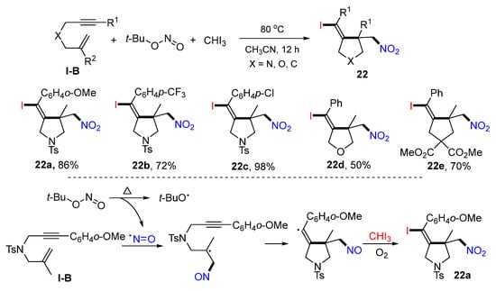In 2021, Zhu and co-workers reported the synthesis of iodo- and nitro-functionalized cyclic compounds such aspyrrolidines, tetrahydrofurans, and cyclopentanes. The reaction of 1,6-enynes, t-BuONO, and iodoform in CH3CN under heating gave five-membered heterocycles 22 in moderate-to-excellent yields (Scheme 21) [34]. The reaction mechanism suggests that nitroso radical formed from the homolysis of t-BuONO adds to the C=C bond of the 1,6-enyne followed by 5-exo cyclization, oxidation to cation, and then iodination with CHI3 to give product 22a.