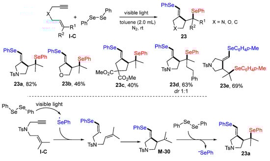 In 2021, Zhu and co-workers reported diarylselenylative cyclization reaction of 1,6-enynes for the synthesis of five-membered heterocycles. The reaction of 1,6-enyne and diaryldiselane in toluene under the radiation of light at room temperature afforded products 23 in moderate to good yields (Scheme 22) [35]. The reaction mechanism shows that the PhSe radical generated via photo homolytic cleavage of PhSeSePh adds to the triple bond of 1,6-enyne followed by 5-exo cyclization to form tertiary carbon radical M-30, which then couples with PhSe radical to give product 23a.