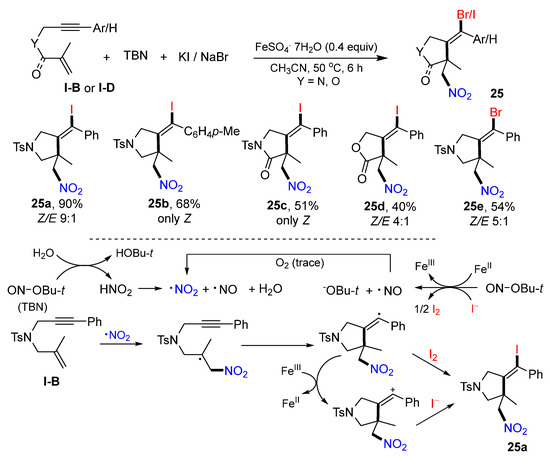 In 2021, Li and Tian’s lab reported Fe-catalyzed radical reaction of 1,6-enynes for the synthesis of difunctionalized heterocycles. The reaction of 1,6-enynes, t-butyl nitrite (TBN) and KI or NaBr as materials in CH3CN under the catalysis of FeSO4·7H2O gave products 25 in good-to-excellent yields (Scheme 24) [37]. As shown in the proposed mechanism, NO2 radical produced from TBN adds to the C=C bond of 1,6-enyne followed by 5-exo cyclization to give vinyl radical. This radical intermediate is iodinated through two possible pathways to give target product 25a.