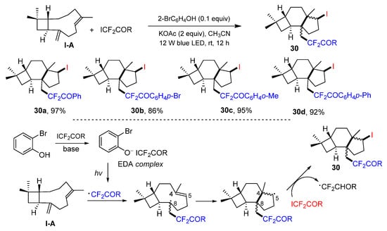 In 2022, a photo reaction of β-caryophyllene, a 1,5-diene with one alkene in the ring and another one out of the ring, for the synthesis of iodo- and CF2-containing protoilludanes was reported by the Huang group. The reaction of β-caryophyllene and ICF2COR in the presence of 2-bromophenol and base under the irradiation of blue LED afforded functionalized protoilludanes 30 in excellent yields (Scheme 29) [42]. A reaction mechanism suggests that the EDA complex generated from 2-bromophenol and ICF2COR leads to the formation of CF2COR radical. It then selectively adds to C8 of β-caryophyllen, followed by the cyclization and abstraction of iodine atom from ICF2COR to give the product 30.