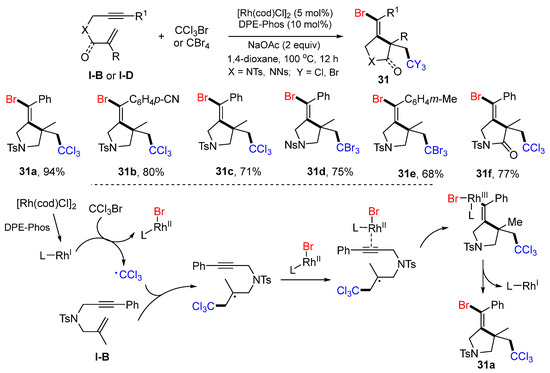 In 2019, the Liu group reported a met-catalyzed reaction of 1,6-enynes or 1,6-enynyl amides for the synthesis of bromotrihalomethylated pyrrolidines. The reaction of 1,6-enynes, and CCl3Br or CBr4 in 1,4-dioxane under the catalysis of [Rh(cod)Cl]2 and DPE-Phos at 100 °C for 12 h gave products 31 in moderate-to-good yields (Scheme 30) [43]. The reaction mechanism suggests that CCl3 radical, generated from CCl3Br under the catalysis of [Rh(cod)Cl]2 and DPE-Phos, adds to the C=C double bond of 1,6-enyne followed by 5-exo cyclization to RhII-LBr activated alkyne and then L-RhI elimination to give product 31a.