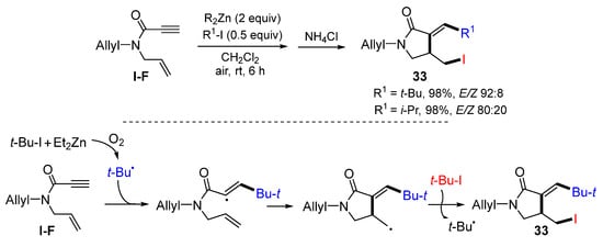 1,6-Eneynyl amides are another kind of popular substrates for radical reactions in the synthesis of functionalized 2-pyrrolidones [45]. In 2008, Feray and Bertrand reported an R2Zn-mediated radical reaction of 1,6-eneynyl amides for the synthesis of functionalized pyrrolidin-2-ones. The reaction of 1,6-eneynyl amides and alkyliodides in the presence dialkylzinc at room temperature gave product 33 in high yields as a mixture of E/Z isomers (Scheme 32) [46]. The reaction mechanism suggests that the t-butyl radical, generated from the reaction of t-BuI and R2Zn in the presence of oxygen, selectively adds to the triple bond of amide to form a stabilized vinyl radical, which then undergoes 5-exo cyclization followed by iodine atom transfer from t-BuI to give product 33.