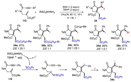 Zhu and co-workers, in 2022, reported a photo synthetic method for making iodo- and sulfonyl-containing cyclic compounds. The reaction of 1,6-enynes, ArSO2Na, and iodoform in CH3CN under visible light irradiation gave products 29 in good-to-excellent yields (Scheme 28) [41]. The reaction mechanism suggests that ArSO2 radical derived from ArSO2Na adds to the C=C double bond of 1,6-enyne, followed by 5-exo cyclization and iodine atom transfer from the complex of ArSO2Na and CHI3, to give product 29a.