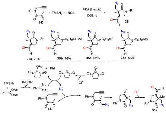 - Ying, W.-W.; Chen, W.-T.; Bao, W.-H.; Gao, L.-H.; Wang, X.-Y.; Chen, G.-P.; Ge, G.-P.; Wei, W.-T. Room temperature, metal-free, radical chloroazidation of 1,6-enynes. Synlett 2018, 29, 1664–1668. [Google Scholar] [CrossRef]