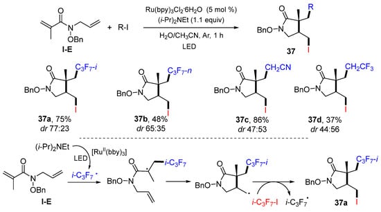 - Yoshioka, E.; Kohtani, S.; Tanaka, E.; Hata, Y.; Miyabe, H. Carbon radical addition- cyclization reaction induced by ruthenium-photocatalyst under visible light irradiation. Tetrahedron 2015, 71, 773–781. [Google Scholar] [CrossRef]