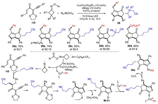 - Lou, J.; Ma, J.; Xu, B.-H.; Zhou, Y.-G.; Yu, Z. Photoinduced, copper-catalyzed three-component annulation of gem-dialkylthio enynes. Org. Lett. 2020, 22, 5202–5206. [Google Scholar] [CrossRef]