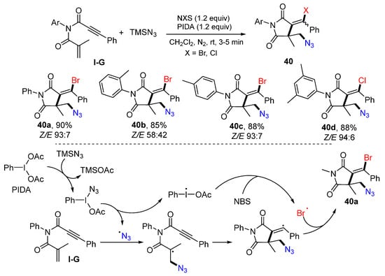 - Gu, Y.; Dai, L.; Mao, K.M.; Zhang, J.H.; Wang, C.; Zhao, L.M.; Rong, L.C. Time-economical radical cascade cyclization/haloazidation of 1,6-enynes: Construction of highly functional succinimide derivatives. Org. Lett. 2020, 22, 2956–2960. [Google Scholar] [CrossRef] [PubMed]