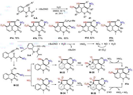 - Liu, Y.; Zhang, J.-L.; Song, R.-J.; Qian, P.-C.; Li, J.-H. Cascade nitration/cyclization of 1,7-enynes with t-BuONO and H2O: One-pot self-assembly of pyrrolo [4,3,2-de]quinolinones. Angew. Chem. 2014, 126, 9163–9166. [Google Scholar] [CrossRef]