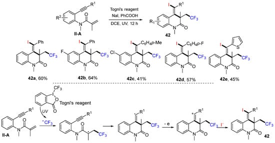 - An, Y.-Y.; Kuang, Y.-Y.; Wu, J. Synthesis of trifluoromethylated 3,4-dihydro- quinolin- 2(1H)-ones via a photo-induced radical cyclization of benzene-tethered 1,7-enynes with Togni reagent. Org. Chem. Front. 2016, 3, 994–998. [Google Scholar] [CrossRef]