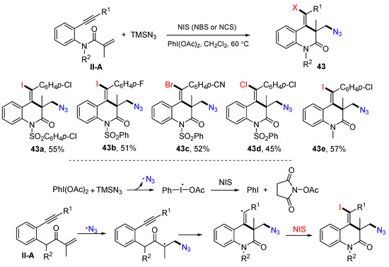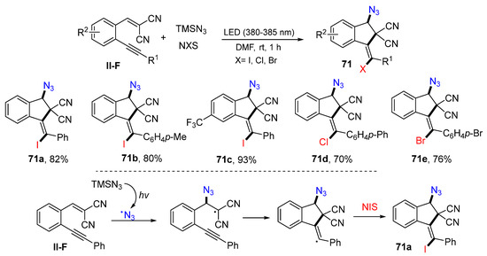 - Zou, L.; Wang, L.; Sun, L.; Xie, X.F.; Li, P.H. Photo-driven haloazidation cyclization of 1,5-enynes having cyano groups with TMSN3 and NIS/NCS/NBS under metal-free conditions. Chem. Comm. 2020, 56, 7933–7936. [Google Scholar] [CrossRef]