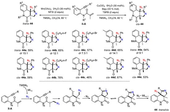 - Zhao, Y.-Y.; Hu, Y.-C.; Wang, H.-L.; Li, X.-C.; Wan, B.-S. Transition-metal controlled diastereodivergent radical cyclization/azidation cascade of 1,7-enynes. J. Org. Chem. 2016, 81, 4412–4420. [Google Scholar] [CrossRef]