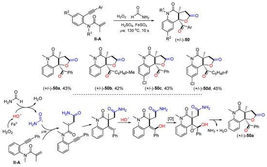 - Ge, Y.; Tian, Y.; Wu, J.; Yan, Q.; Zheng, L.; Ren, Y.; Zhao, J.; Li, Z. Iron-promoted free radical cascade difunctionalization of unsaturated benzamides with silanes. Chem. Commun. 2020, 56, 12656–12659. [Google Scholar] [CrossRef]