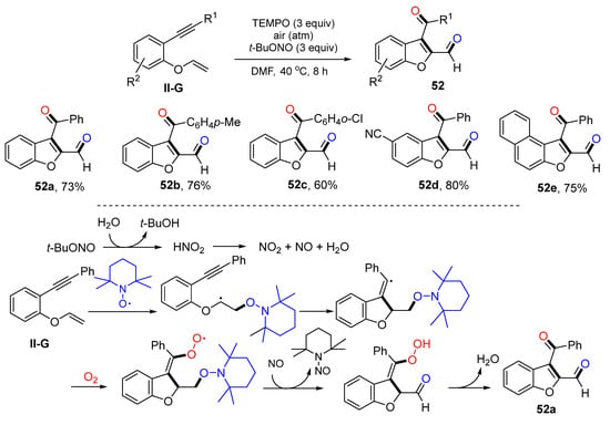 - Hu, M.; Song, R.-J.; Li, J.-H. Metal-free radical 5-exo-dig cyclizations of phenol-linked 1,6-enynes for the synthesis of carbonylated benzofurans. Angew. Chem. Int. Ed. 2015, 54, 608–612. [Google Scholar] [CrossRef]