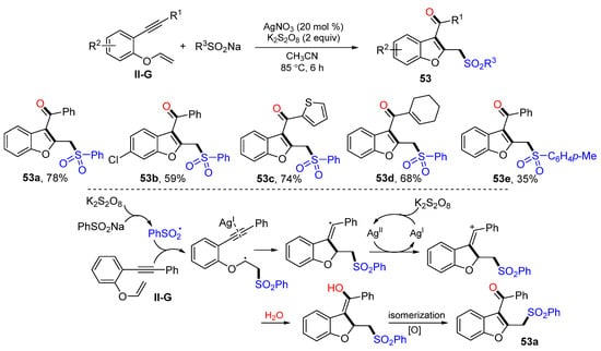 - Wu, W.-Q.; Yi, S.-J.; Huang, W.; Luo, D.; Jiang, H.-F. Ag-catalyzed oxidative cyclization reaction of 1,6-enynes and sodium sulfinate: Access to sulfonylated benzofurans. Org. Lett. 2017, 19, 2825–2828. [Google Scholar] [CrossRef] [PubMed]