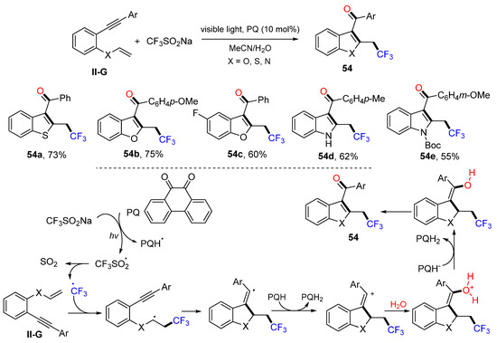 - Shang, X.-J.; Liu, D.; Liu, Z.-Q. A NaSO2CF3/NaBrO3-mediated bromotrifluoromethylation of enyne via free-radical cascade processes. Org. Chem. Front. 2018, 5, 2856–2859. [Google Scholar] [CrossRef]