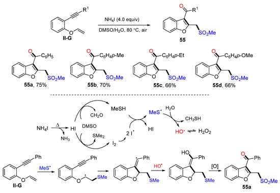 - Zhang, J.; Cheng, S.-J.; Cai, Z.-Q.; Liu, P.; Sun, P.-P. Radical addition cascade cyclization of 1,6-enynes with DMSO to access methylsulfonylated and carbonylated benzofurans under transition-metal-free conditions. J. Org. Chem. 2018, 83, 9344–9352. [Google Scholar] [CrossRef] [PubMed]