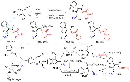 - Wang, L.; Qi, C.-R.; Cheng, R.-X.; Liu, H.-J.; Xiong, W.-F.; Jiang, H.-F. Direct access to trifluoromethyl-substituted carbamates from carbon dioxide via copper-catalyzed cascade cyclization of enynes. Org Lett. 2019, 21, 7386–7389. [Google Scholar] [CrossRef]