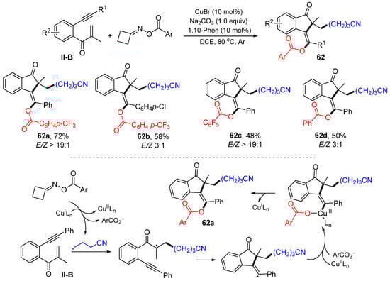 - Wang, S.-C.; Shen, Y.-T.; Zhang, T.-S.; Hao, W.-J.; Tu, S.-J.; Jiang, B. Cyclic oxime esters as deconstructive bifunctional reagents for cyanoalkyl esterification of 1,6-enynes. J. Org. Chem. 2021, 86, 15488–15497. [Google Scholar] [CrossRef] [PubMed]