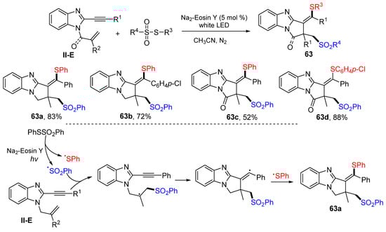 - Liu, Y.; Zhang, N.-N.; Xu, Y.-L.; Chen, Y.-Y. Visible-light-induced radical cascade reaction of 1-allyl-2-ethynylbenzoimidazoles with thiosulfonates to assemble thiosulfonylated pyrrolo [1,2-a]benzimidazoles. J. Org. Chem. 2021, 86, 16882–16891. [Google Scholar] [CrossRef]
