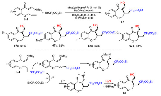 - Xiang, H.-Y.; Zhao, Q.-L.; Xia, P.-J.; Xiao, J.-A.; Ye, Z.-P.; Xie, X.; Sheng, H.; Chen, X.-Q.; Yang, H. Visible-light-induced external radical-triggered annulation to access CF2-containing benzoxepine derivatives. Org. Lett. 2018, 20, 1363–1366. [Google Scholar] [CrossRef]