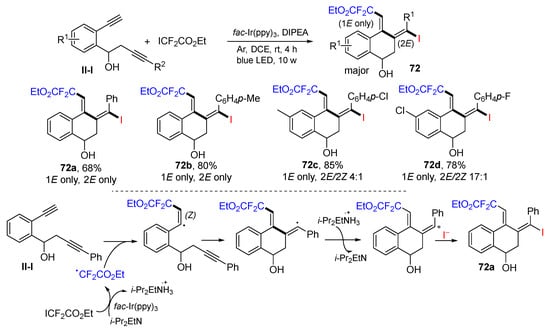 In 2022, Li and Yang reported a visible light-promoted reaction of 1,6-enynes for the synthesis of the iodovinyl- and CF2-functionalized heterocycles. The reaction of 1,6-enynes, ICF2CO2Et under the radiation of blue LED afforded products 28 in good-to-excellent yields (Scheme 27) [40]. The reaction mechanism suggests that CF2CO2Et radical derived from ICF2CO2Et adds to the C=C double bond of 1,6-enyne, followed by 5-exo cyclization and capture of iodine atom from ICF2CO2Et, to give product 28.