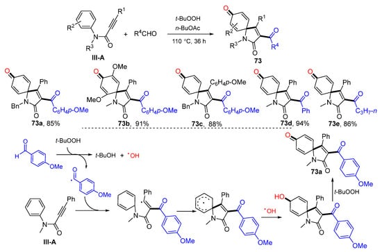 - Ouyang, X.-H.; Song, R.-J.; Li, Y.; Liu, B.; Li, J.-H. Metal-free oxidative ipso-carboacylation of alkynes: Synthesis of 3-acylspiro [4,5]trienones from N-arylpropiolamides and aldehydes. J. Org. Chem. 2014, 79, 4582–4589. [Google Scholar] [CrossRef] [PubMed]