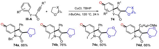 - Wei, W.-T.; Song, R.-J.; Ouyang, X.-H.; Li, Y.; Li, H.-B.; Li, J.-H. Copper-catalyzed oxidative ipso-carboalkylation of activated alkynes with ethers leading to 3-etherified azaspiro [4.5]trienones. Org. Chem. Front. 2014, 1, 484–489. [Google Scholar] [CrossRef]