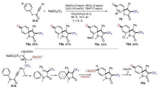 - Hua, H.-L.; He, Y.-T.; Qiu, Y.-F.; Li, Y.-X.; Song, B.; Gao, P.; Song, X.-R.; Guo, D.-H.; Liu, X.-Y.; Liang, Y.-M. Copper-catalyzed difunctionalization of activated alkynes by radical oxidation-tandem cyclization/dearomatization to synthesize 3-trifluoromethyl spiro-[4.5] trienones. Chem. Eur. J. 2015, 21, 1468–1473. [Google Scholar] [CrossRef] [PubMed]