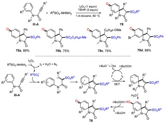 - Wen, J.-W.; Wei, W.; Xue, S.-N.; Yang, D.-S.; Lou, Y.; Gao, C.-Y.; Wang, H. Metal-free oxidative spirocyclization of alkynes with sulfonylhydrazides leading to 3-sulfonated azaspiro-[4,5]trienones. J. Org. Chem. 2015, 80, 4966–4972. [Google Scholar] [CrossRef]