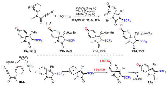 - Jin, D.-P.; Gao, P.; Chen, D.-Q.; Chen, S.; Wang, J.; Liu, X.-Y.; Liang, Y.-M. AgSCF3-mediated oxidative trifluoromethythiolation of alkynes with dearomatization to synthesize SCF3- substituted spiro [4,5]trienones. Org. Lett. 2016, 18, 3486–3489. [Google Scholar] [CrossRef]