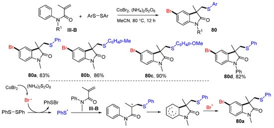 - Cheng, F.; Bai, X.; Sun, Q.W.; Zhu, G.F.; Dong, Y.X.; Yang, Y.Y.; Gao, X.L.; Guo, B.; Tang, L.; Zhang, J.Q. Cobalt-promoted synthesis of sulfurated oxindoles via radical annulation of N-arylacrylamides with disulfides. Org. Biomol. Chem. 2022, 20, 6423–6431. [Google Scholar] [CrossRef]