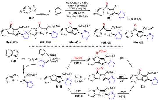 - Wang, L.; Li, M.; Ning, Z.; Zhang, X.; Fu, Y.; Du, Z. Copper- and visible-light-catalyzed cascade radical cyclization of N-propargylindoles with cyclic ethers. J. Org. Chem. 2022. [Google Scholar] [CrossRef]
