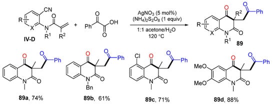 - Wang, S.-S.; Fu, H.; Shen, Y.; Sun, M.; Li, Y.-M. Oxidative radical addition/cyclization cascade for the construction of carbonyl-containing quinoline-2,4(1H,3H)-diones. J. Org. Chem. 2016, 81, 2920–2929. [Google Scholar] [CrossRef]