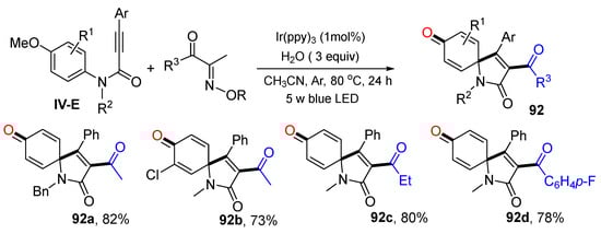 - Liu, Y.; Wang, Q.-L.; Zhou, C.-S.; Xiong, B.-Q.; Zhang, P.-L.; Yang, C.-A.; Tang, K.-W. Visible-light-mediated ipso-carboacylation of alkynes: Synthesis of 3-acylspiro-[4,5]trienones from N-(p-methoxyaryl)propiolamides and acyl chlorides. J. Org. Chem. 2018, 83, 2210–2218. [Google Scholar] [CrossRef]