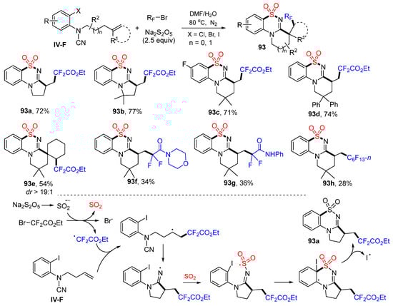 - Wu, S.P.; Wang, D.K.; Kang, Q.Q.; Ge, G.P.; Zheng, H.X.; Zhu, M.L.; Li, T.; Zhang, J.Q.; Wei, W.T. Sulfonyl radical triggered selective iodosulfonylation and bicyclization of 1,6-dienes. Chem. Commun. 2021, 57, 8288–8291. [Google Scholar] [CrossRef]