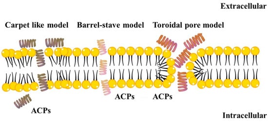 Schematic representation of the most significant models of ACPs action. The yellow circles and the black linkers represent the hydrophilic and hydrophobic regions, respectively, of the phospholipid cell membranes.