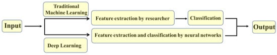 Schematic representation showing the main difference between traditional machine and deep learning approaches.