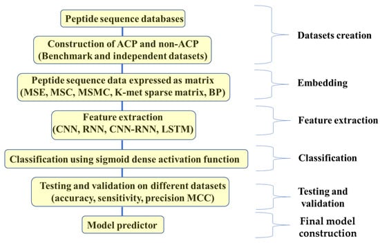 Peptides are small bioactive proteins, ranging between 10 and 100 amino acid units, that perform various biochemical roles in the body [,]. They are linked by peptide bonds that are formed by dehydration and condensation. The application of peptides in medicine was first proposed in 1922 through the use of insulin extracted from animal pancreas in the treatment of type 1 diabetes []. To date, more than 600 peptides have been applied in clinical and preclinical investigations, of which 60 have been approved as drugs [,]. These therapeutic applications of these peptides include cancer treatment, drug-delivery systems, hormonal regulators, inflammation modulators, vaccines, antibiotics and quorum-sensing molecules [,,,,,]. Peptides that have therapeutic effects are classified into three main categories based on their source: natural, artificially modified and artificially synthesized [,]. They can be obtained from living organisms, such as animals, plants, bacteria and fungi. They can also be attained through proteolysis, synthesized chemically or by recombinant genes [,]. Recently, computational methods such as traditional machine learning (ML) and deep learning (DL), which are a subset of artificial intelligence (AI), have been employed in ACPs screening [,,] in order to overcome potential adverse in vitro effects due to peptidases or unknown immunogenicity [].