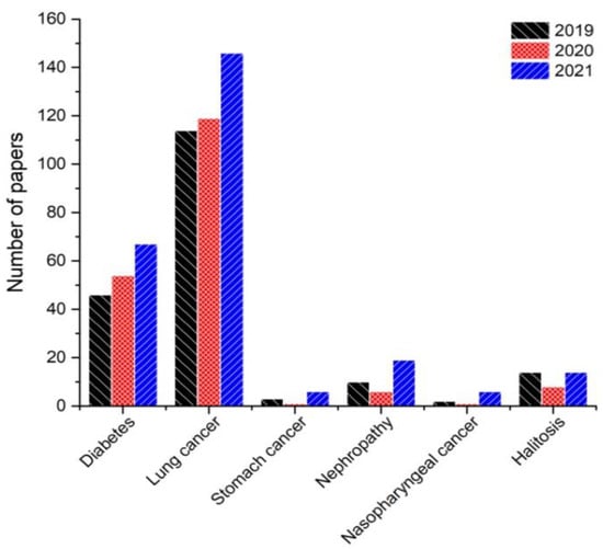 Number of papers in 2019–2021 related to the analysis of biomarkers of diseases.